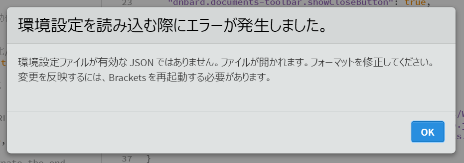 上記のエラーメッセージの【環境設定を開く】をクリックすると、【brackets.json】ファイルが開きます。