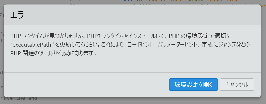 PHPランタイムが見つかりません。PHPランタイムをインストールして、PHPの環境設定で適切に”executablePath”を更新してください。これにより、コードヒント、パラメータ、定義にジャンプなどのPHP関連のツールが有効になります。
